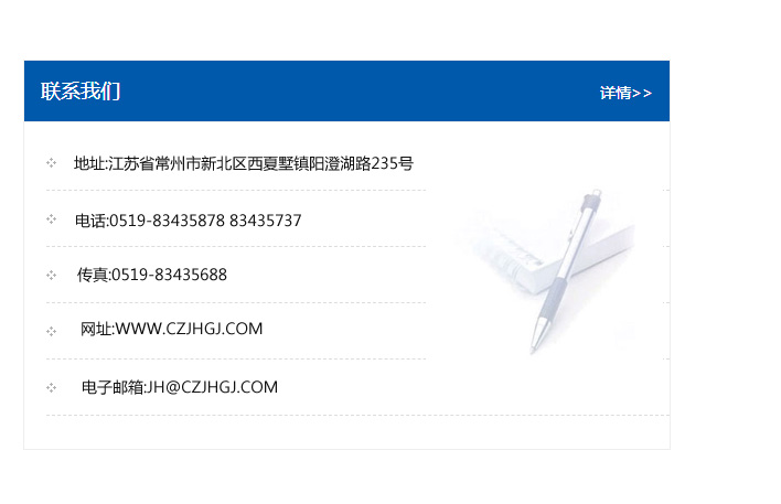 地址:常州市新北區友邦商務大廈1幢16、17層  電話:0519-85101652  傳真:0519-85112595  郵編:213022  網址:www.cz-jiayue_cn.heiqikm.com  郵箱:xiajifengaa@163.com